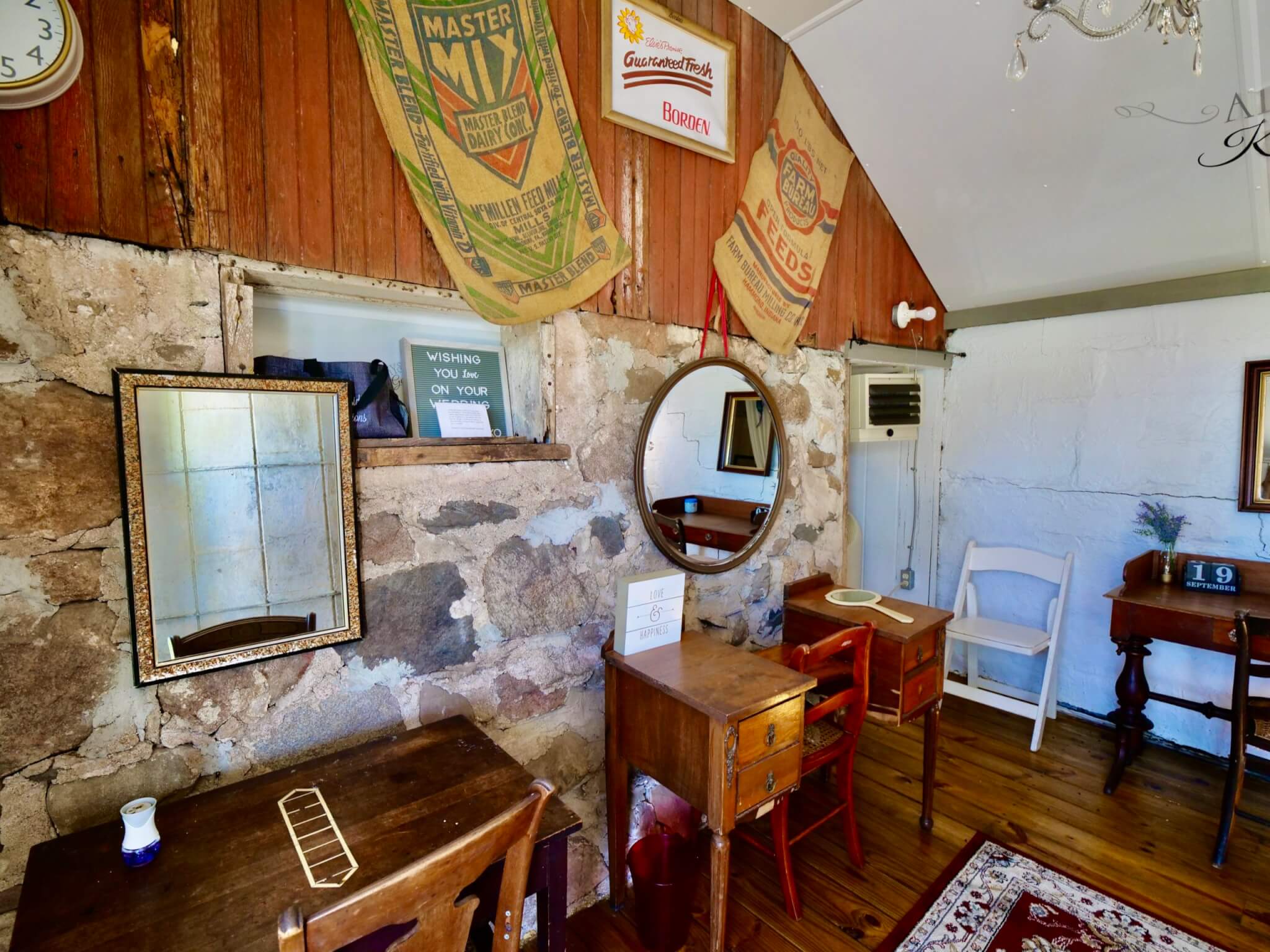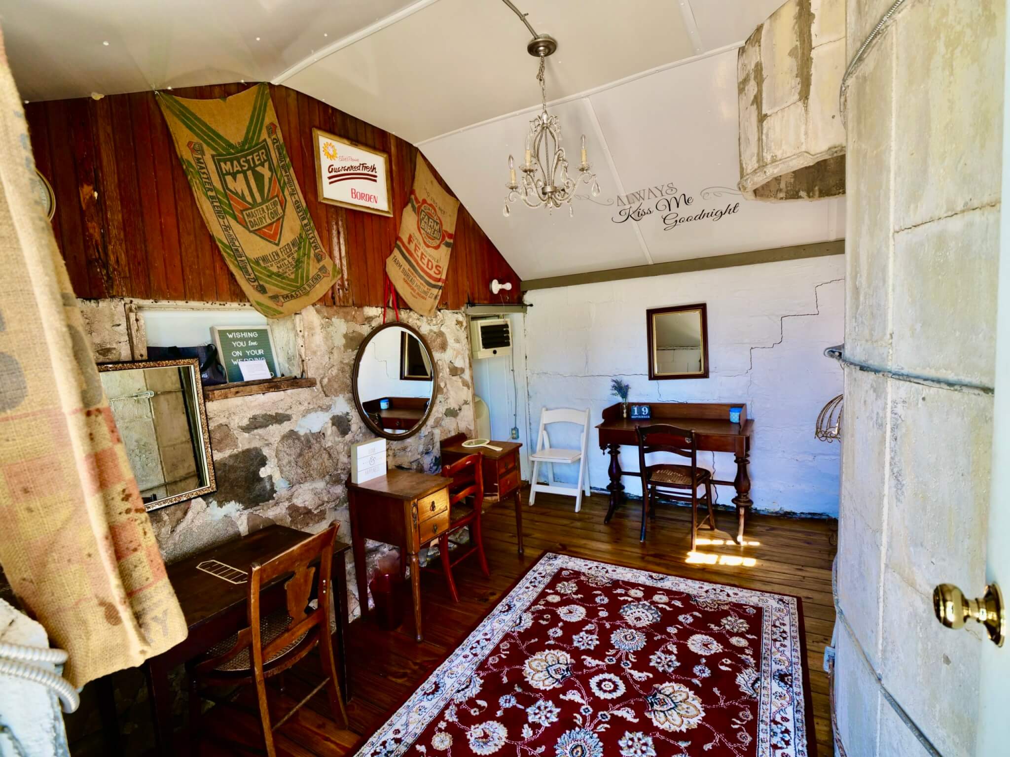 What used to be the feed room is now the hair and makeup area with three antique vanities, plenty of mirrors to touch up your makeup, multiple outlets, and heat and air.
